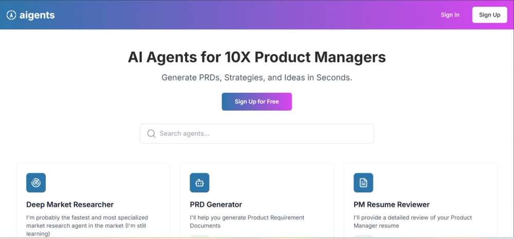 aigents.pm is a free AI-powered platform offering specialized agents for product managers to automate PRD creation, strategy development, resume reviews, and ideation, boosting productivity in seconds.