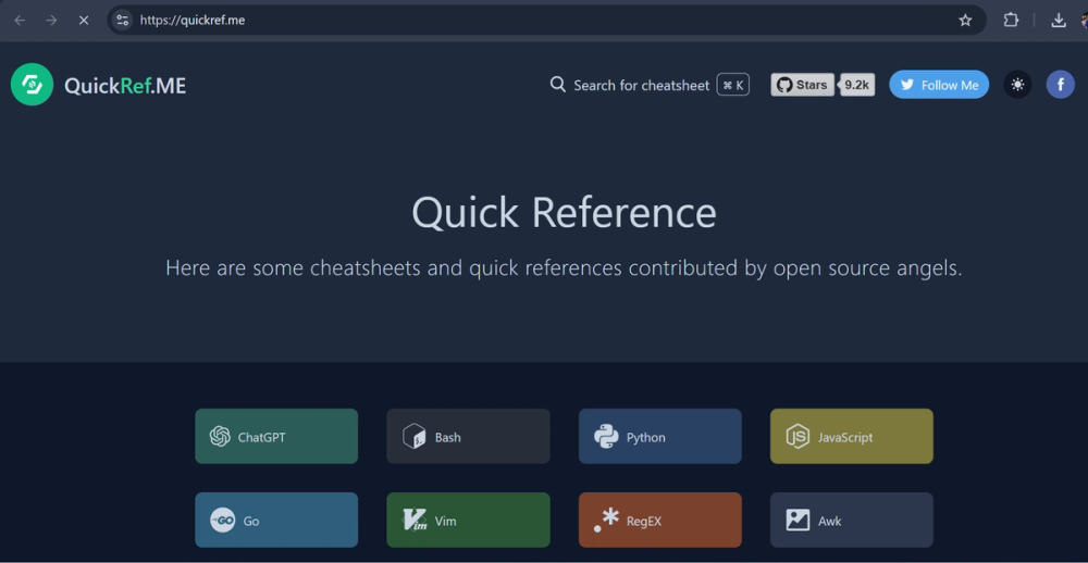 QuickRef.me is a developer-focused site offering concise cheat sheets for programming languages like JavaScript, Python, and Go, plus Linux commands and dev tools—ideal for quick syntax and command lookups.