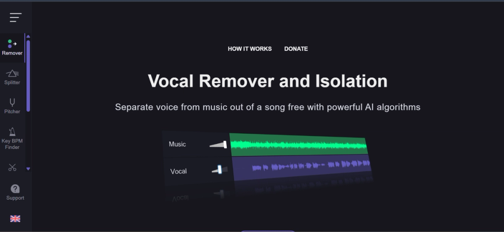 VocalRemover.org is a free online AI tool that separates vocals from music in songs, producing karaoke (instrumental) and acapella (isolated vocals) tracks in ~10 seconds. Ideal for remixing and audio editing.